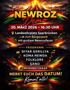 Das Kurdische Gesellschaftszentrum Saarbrücken sagt wegen der Verbreitungsgefahr des Corona-Virus die Newroz-Demonstration am Mittwoch, 18. März 2020 ab.