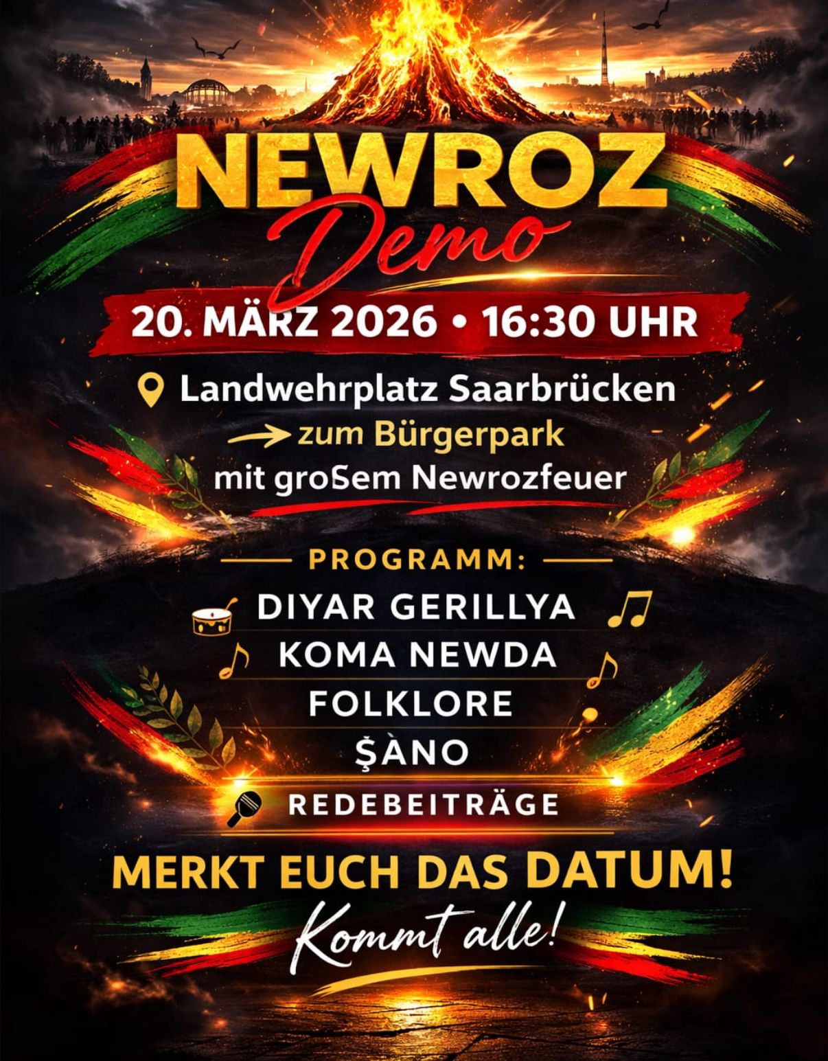 Das Kurdische Gesellschaftszentrum Saarbrücken feiert jedes Jahr zum Frühlingsanfang sein Widerstandsfest NEWROZ. Dieses Jahr werden wir am Mittwoch, 20. März 2024, um 17.00 Uhr mit einem Auftakt am Landwehrplatz Saarbrücken beginnen.